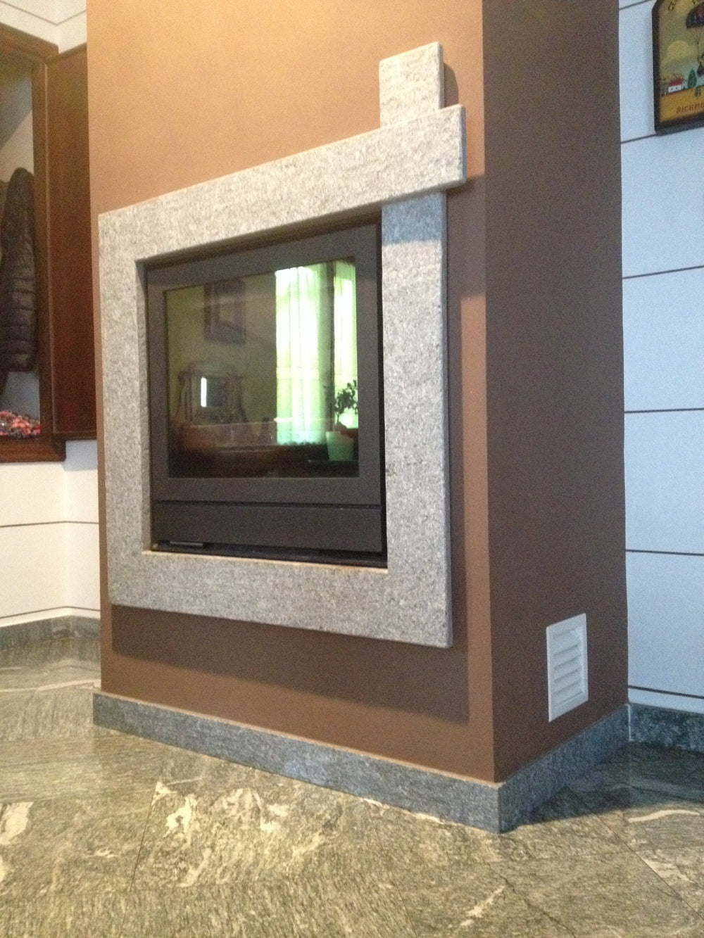 Caminetto rivestito con liste da muro a spacco tranciate miste in pietra di Luserna.