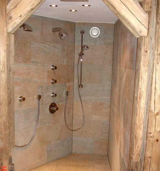 Doccia in piastrelle in pietra di Luserna fiammata spazzolata.